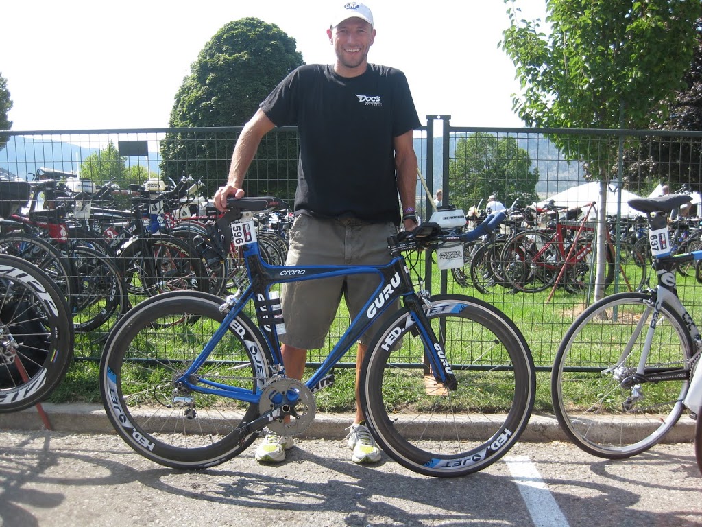 This morning, I got up and drove to Kelowna to pick up Aaron. He did some pretty crafty work and managed to get a new passport yesterday. It was great to see him! Although I would have understood if he hadn’t been able to make it, I’m really happy it worked out. We spent the morning getting my bike and gear bags together and then went down to transition to drop it all off. Here’s me posing with the Guru in all it’s glory:
