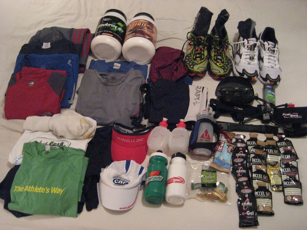 While I was packing last night, I laid everything out on the bed just to make sure I wasn’t forgetting anything. It’s amazing how much stuff I’m packing for a “run” – two pairs of shoes, enough gels to stock an aid station, extra socks, shirts for every contingency, a hat and a visor, a watch, a back-up watch… Options, lots of options. Here’s a picture of my clothing and gear for the race (including what I’ll wear before the race):