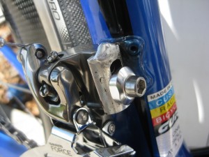 When I got up this morning I was pretty conflicted about whether or not welding the hanger was the right idea. It really seemed like the only solution, but a few people voiced concerns about the heat from the torch damaging the carbon fiber frame. Most likely the weld would get the aluminum derailleur hanger back together, but there was a chance that I’d wreck the carbon fiber frame in the process. I spent the morning trying to reach someone at Guru and called a few authorized dealers on the East Coast (the shops on the West Coast weren’t open at 7am local time) and following a message I posted on Slowtwitch to see if anyone had any other thoughts. No one had any solutions that were practical given the time constraints. So… we went to the welder.