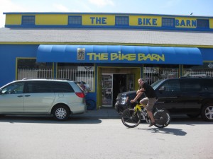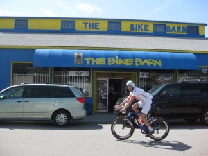 A nice, relaxed swim in the lake and the next stop was Bike Barn, where the mechanic from yesterday, Ian (that’s him riding by the front of the shop above), seemed just as happy to see the welded hanger as I was. The staff at Bike Barn, all of whom heard the story yesterday, crowded around to look and praise the weld. Ian is such a nice guy and has an incredible positive, encouraging attitude. I’m sure the other wrenches there are great, but if you’re in Penticton and need bike work, definitely hit Bike Barn and ask for Ian! He took the bike he had been working on off the stand, put mine up there and went to work. He recommended a new derailleur, and at that point, I would have followed just about any bike-related recommendation he made! He fixed it all up quickly, took it on a little test spin and presented me my all fixed up bike.