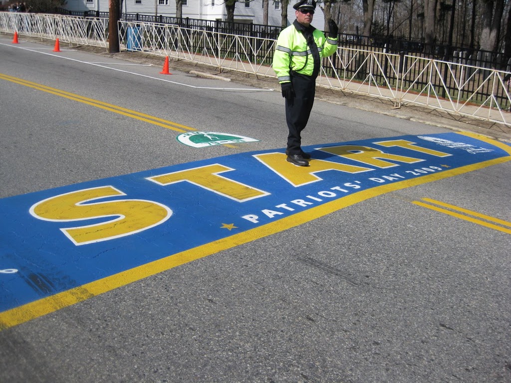 The tour started in Boston and we took the highway out to Hopkinton. In Hopkinton, we got out of the bus and got to walk around the start for 15 minutes. In addition the tourists/runners there was a lot going on at the start – set-up crew, vendors, cops. It was exciting to see it all getting in motion.