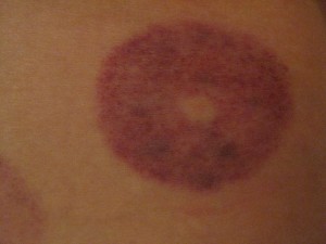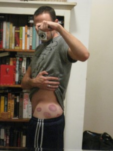 Even if it involves putting a bunch of suction cups on my hip and ass (maybe that’s especially if it involves a bunch of suction cups on my hip and ass)! It’s called “cupping” and supposedly it helps break up the scar tissue that’s restricting my soft tissue. (I actually tried cupping once before, back in 2003 – that time it was the “fire cupping” where the suction is caused by a little flame that sucks the air out of the cup. This way hurt more but is definitely less dangerous!) I started seeing a new ART/manual therapy guy right before our trip to LA and had my third session with him today. He comes very well recommended by a few friends. He spends most of each hour-long session really ripping my body apart. From neck to toes, it sometimes feels like he’s tearing my skin off. But with the hope that it will work, I don’t complain. He wanted to try the cupping as part of today’s treatment and like the title says, at this point, anything’s a go. He stuck about 10 of them on my hip, ass cheek and low back, pulled a little plunger to get a tight suction and left them there for a few minutes.
