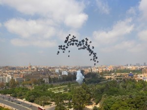 My parents were in town this weekend and we had a great time hanging out. I ate very well and we spent an afternoon at the Guggenheim, seeing “I Want to Believe,” a fantastic exhibit of the art of Cai Guo-Qiang, a Chinese artist who specializes in working with gunpowder. He does work on canvas, where he uses gunpowder to burn images into the media, he also does massive public art displays and has put together amazing, unique fireworks shows, like creating a rainbow of special black fireworks over Valencia, Spain in 2003 (picture above). He also does sculpture and interactive art. The videos of his past works were really amazing. It was a great exhibit, especially for someone like me who normally isn’t such a museum person.
