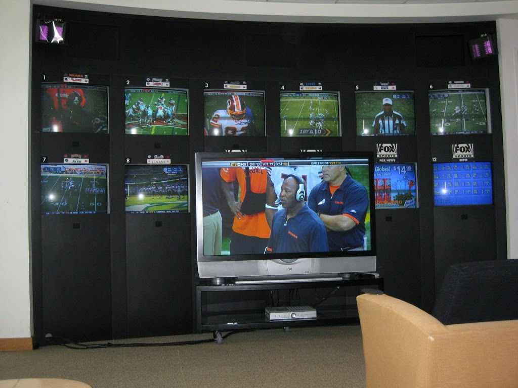 The day started with us standing on the soundstage watching the taping of the pre-game show. It was pretty sweet. They took got a picture of us with the whole broadcast team on the set, but I don’t have that yet. And we weren’t allowed to take any of our own pictures in there. But this was the TV set-up in room where we got to watch the games. Not bad!