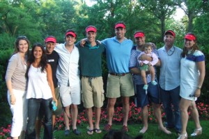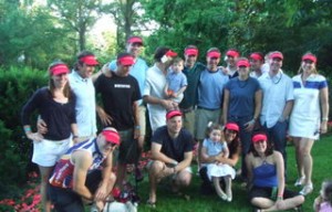 Group shot of most of our “team” the night before the race, wearing the red visors: