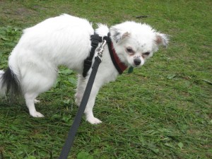We took Charlie with us and he was a really good sport in the rain and walking through puddles that were about belly-high for him. After I checked in for the race (which was inside – in the high school gymnasium) and we were back outside, he started getting cold and tired of the rain. A pretty pissed off Charlie, just before we decided we needed to carry him: