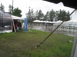 To avoid the rain, we ventured into the Ironman®-branded goodies tent. Damn, they put their M-Dot logo on everything! Of course it’s on the T-shirts and hats, but you can get all kinds of bags, water bottles, stickers, keychains, jackets, shorts, baby clothes, banners, you name it. I escaped with just a visor… for now.