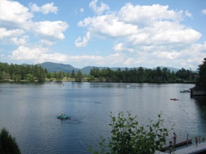 We got into Lake Placid mid-afternoon today. My folks were already here waiting. It was a beautiful, sunny afternoon. Probably a little warmer than would be ideal for an Ironman, but great for walking around and exploring. Here’s the view of the lake from our hotel room – you can’t really see the race course buoys in this picture, but they’re there: