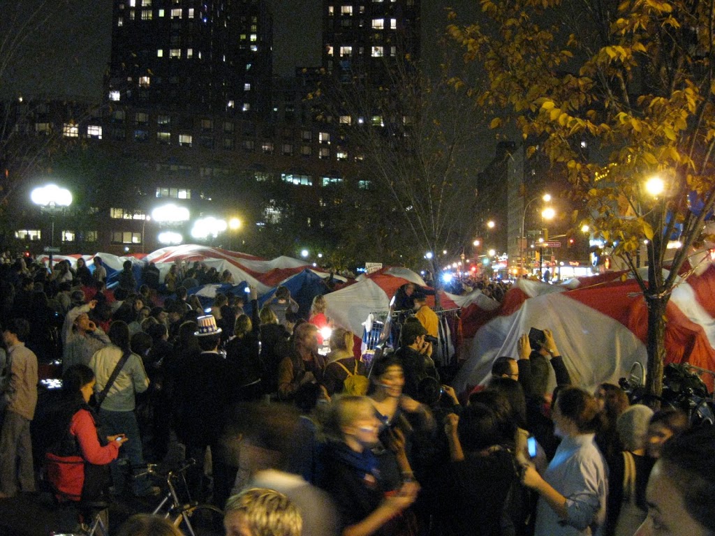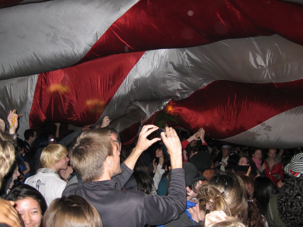 First things first: What a night! By the time yesterday rolled around (long before that, really) I was very emotionally invested in the Obama-Biden campaign, and I certainly wasn’t the only one. There was a lot of pent up anger, fear, nerves, hopefulness and excitement ready to blow. We had a few people over to have a few drinks and watch the returns and it wasn’t long before any anxiety turned to excitement. It was about one second after 11PM EST that the networks called it for Obama and it was about three seconds later that the screaming and cheering and honking started outside our window on University Place. We quickly got our stuff together and headed over to Union Square, where the crowd was already in the thousands. The main activity was this massive flag that covered most of the southern end of Union Square and was being held up one the outsides like a tent.